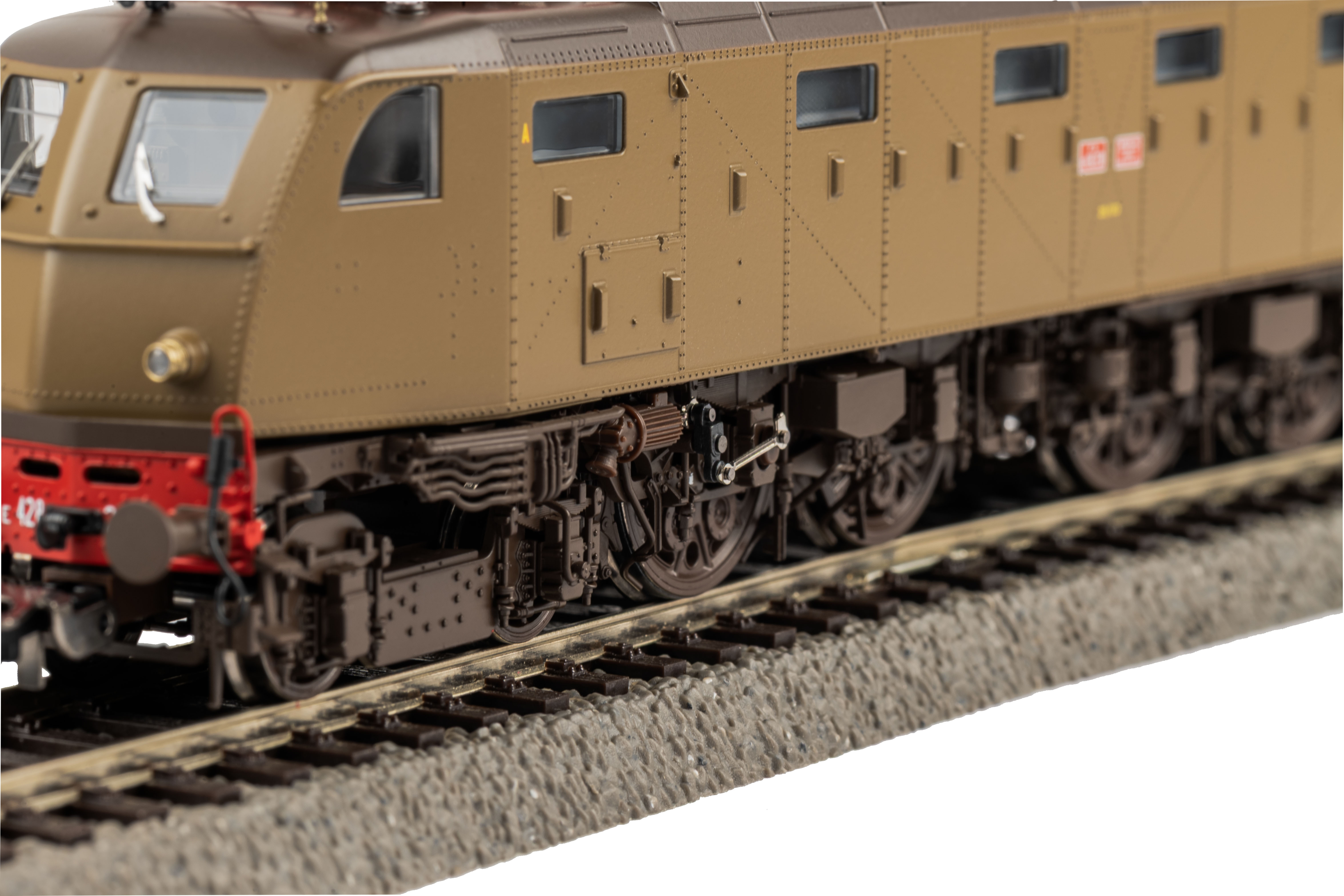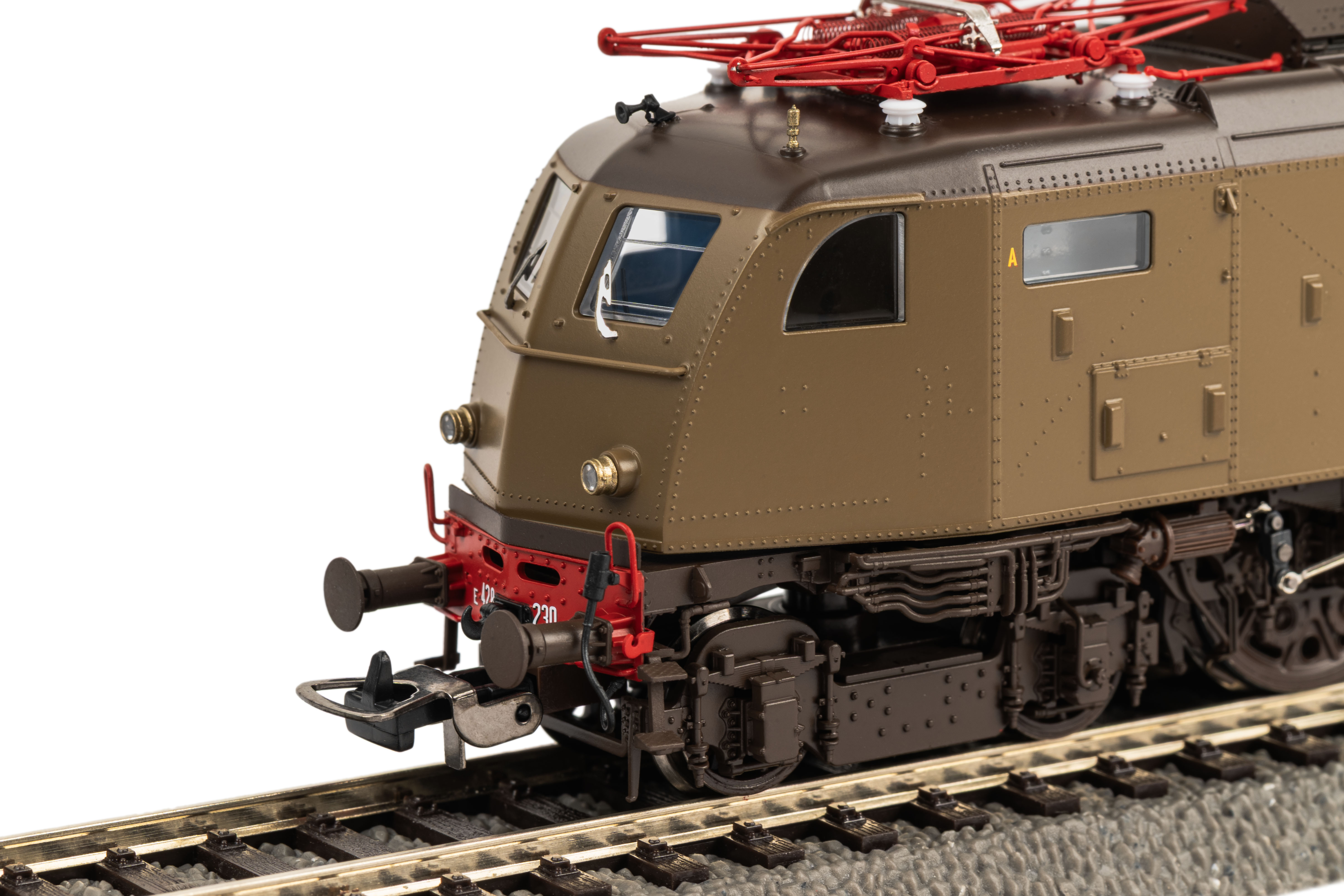 Locomotiva E.428.230 di terza serie aerodinamica, del Dep.Loc. MILANO Sm.to., costruttore ANSALDO S.A., riproduce esattamente la locomotiva reale, ambientata alla fine dell’epoca epoca III (1949 al 1967 ). Fanali d ‘origine, carrelli tipo d’origine, senza corrimani verticali sui frontali, senza ripetitori di segnali, senza coprigiunti sulle cabine e senza chiodature sui frontali.