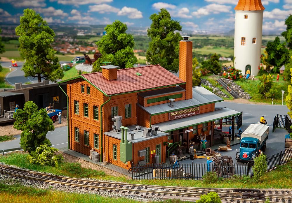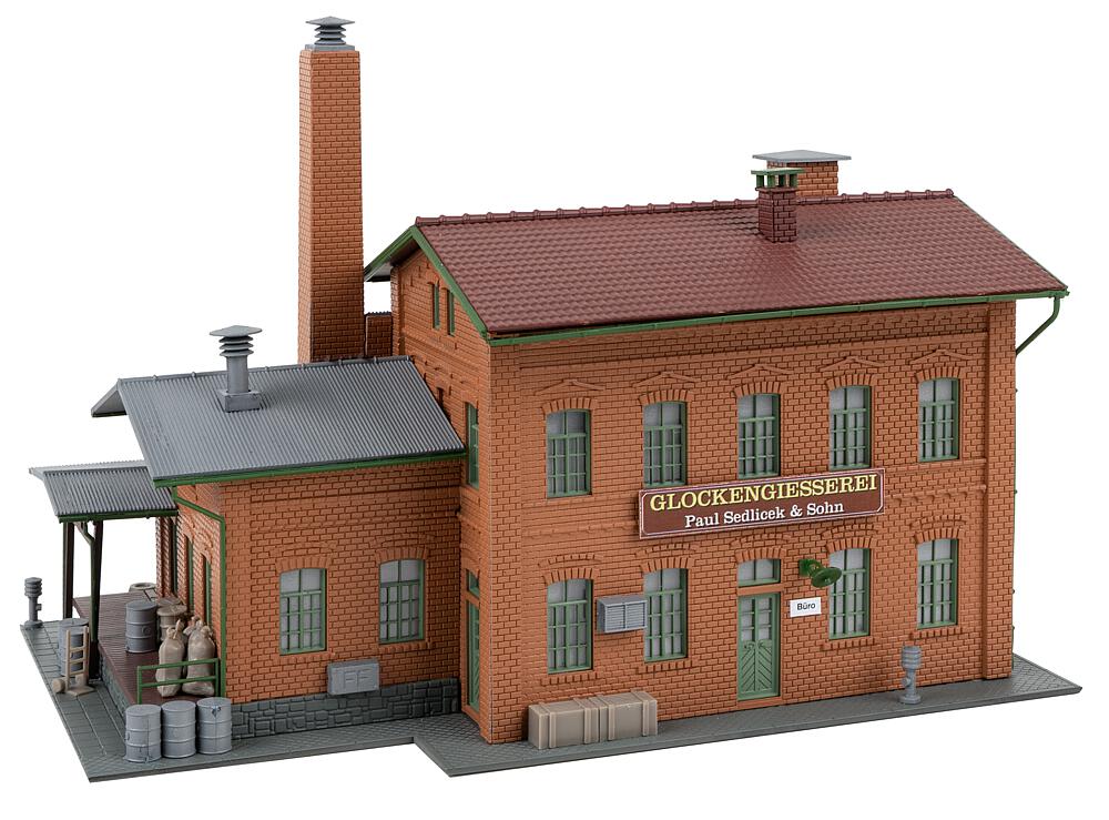 Stabilimento industriale in mattoni! Questo modello ricco di dettagli raffigura una fonderia di campane di lunga tradizione, dove vengono fuse campane di ogni dimensione. L'edificio principale a due piani con tetto a due falde è realizzato in mattoni rossi ed è dotato di finestre ad arco finemente riprodotte. Sul lato dell'edificio si trova un annesso con tetto in lamiera ondulata e rampa laterale, che rende realistiche le scene di carico. Un alto camino e numerosi dettagli secondari come barili, sacchi, lampade e cartelli completano l'autentica atmosfera industriale.