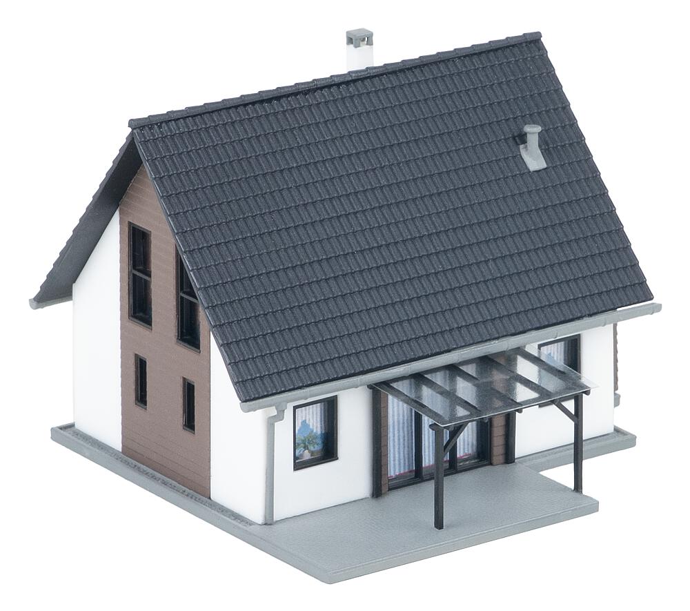 Moderna casa unifamiliare con elementi di facciata grigio-marroni, veranda, copertura per terrazza e raffinata ringhiera in parti incise. Grazie alla struttura ben studiata, è particolarmente facile da costruire – ideale anche per i principianti.